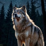 Картинка на рабочий стол: волк, ночное небо, звезды, лес