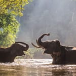 Фото: слоны, природа, водоем, лес, животные, свет, пейзаж