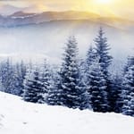 Фото: зима, лес, снег, пейзаж, лучи, солнце, деревья, небо
