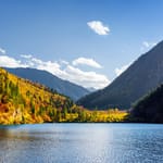 Фото: осень, лес, деревья, небо, желтый, горы, озеро, облака