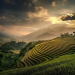 Прикольное фото из раздела Природа. Теги: #вода #зелень #закат #природа #террасы #горы #пейзаж. Разрешение оригинала этих обоев 3840x2560. Эти обои уже скачали 295 раз.