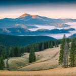 Картинка: горы, лес, природа, пейзаж, туман, восход, отдых
