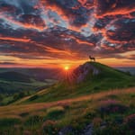 Обои для рабочего стола: закат, олень, силуэт, горы
