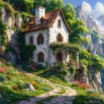 Фотография: дом, коттедж, ИИ, альпийские горы, цветы