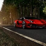 Автомобиль, красный, природа, дорога, лес...