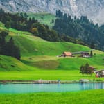 Удивительная заставка на рабочий стол из рубрики Природа. Теги: #спокойствие #деревня #зелень #пейзаж #озеро #горы #природа. Исходный размер обоев 6000x3376. Это изображение скачали 767 раз.