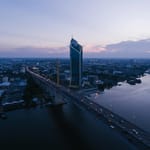 Красивые обои для рабочего стола из раздела Города. Теги: #свет #транспорт #пейзаж #архитектура #вечер #река #мост #здание #небо #город. Оригинальное разрешение картинки 3857x2891. Это фото уже скачали 86 раз.